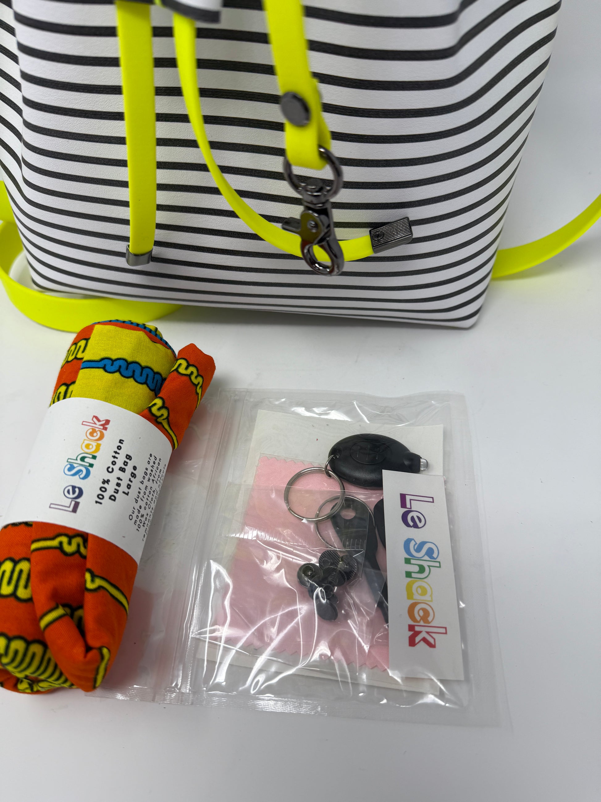 This one is made with black and white striped leather with neon yellow stitching and a neon yellow Biothane drawstring and shoulder strap with heavyweight black hardware. It also has our “find yer keys” strap, a leather care kit, and a dust bag to store your bag in so it stays protected when not in use.