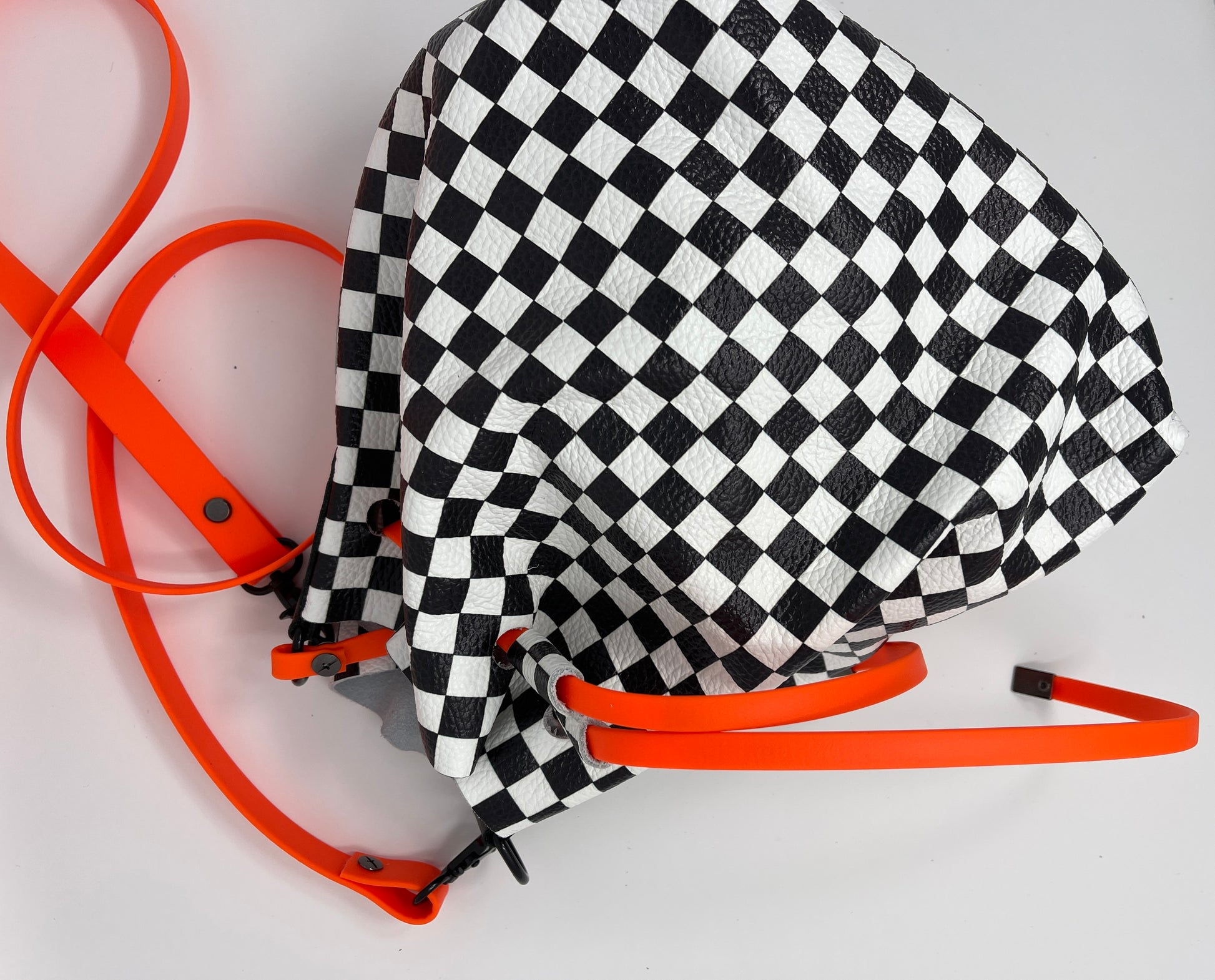 Checkerboard Leather and Neon Orange Drawstring Crossbody Bucket Bag
