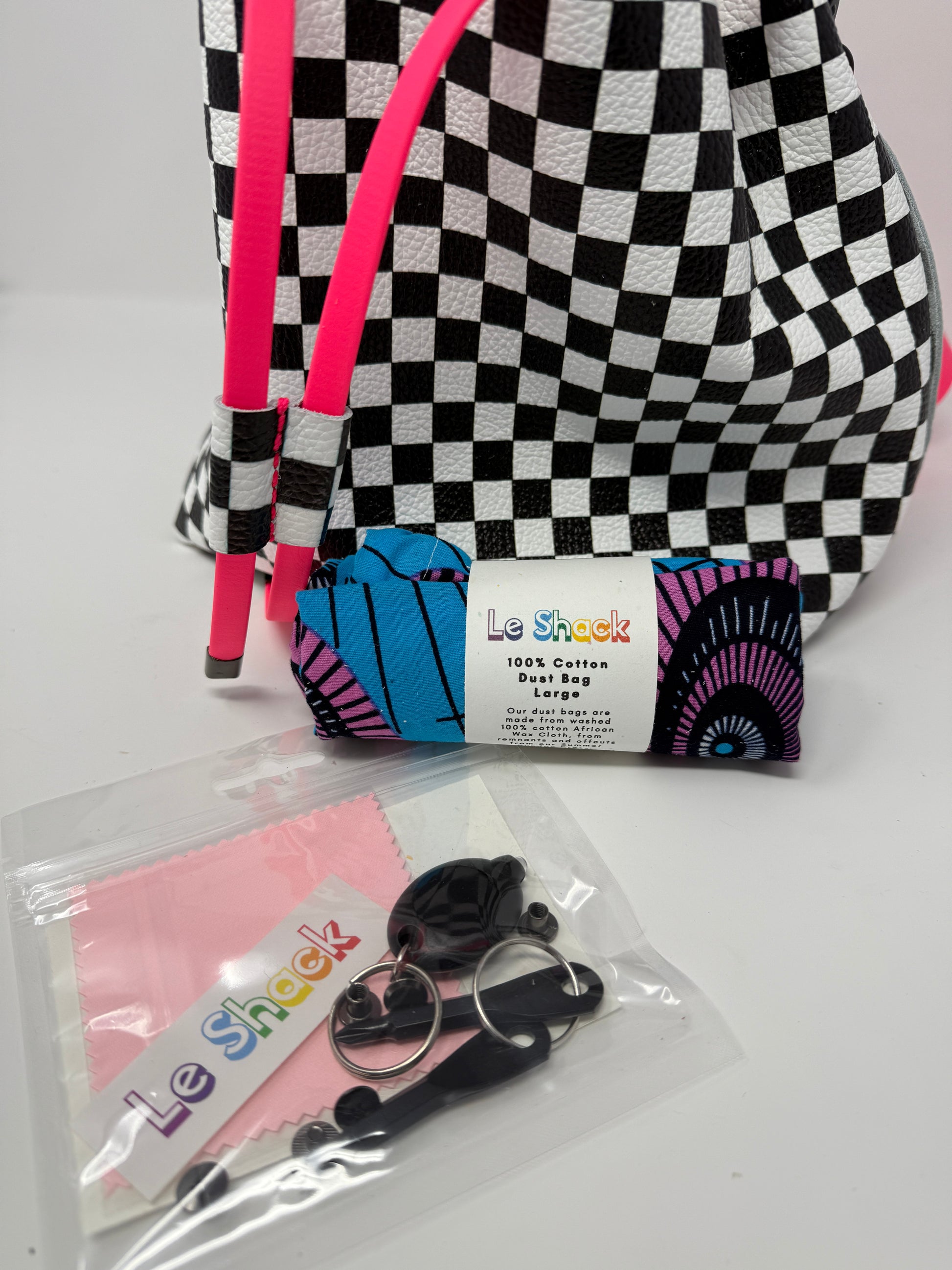 This one is made with checkerboard leather with neon pink stitching and a neon pink Biothane drawstring and shoulder strap with heavyweight black hardware. It also has our “find yer keys” strap, a leather care kit, and a dust bag to store your bag in so it stays protected when not in use.