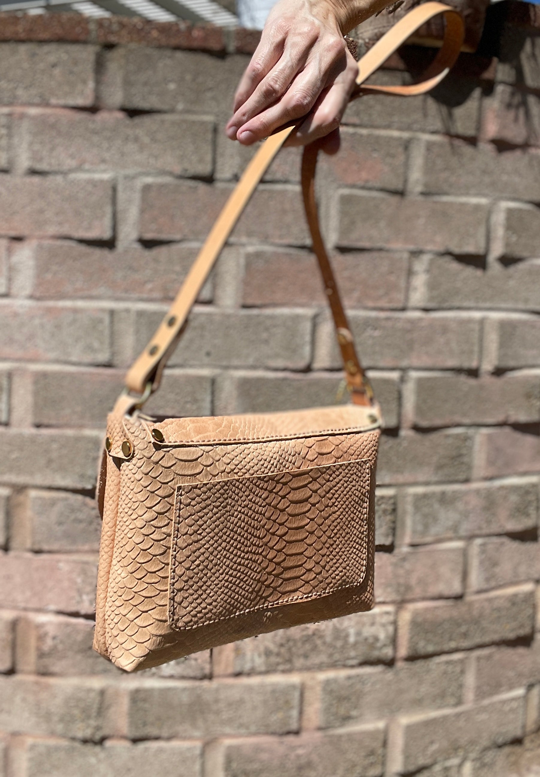 Natural Veg Tan Reptile Embossed Leather Medium Crossbody Flap Messenger Bag