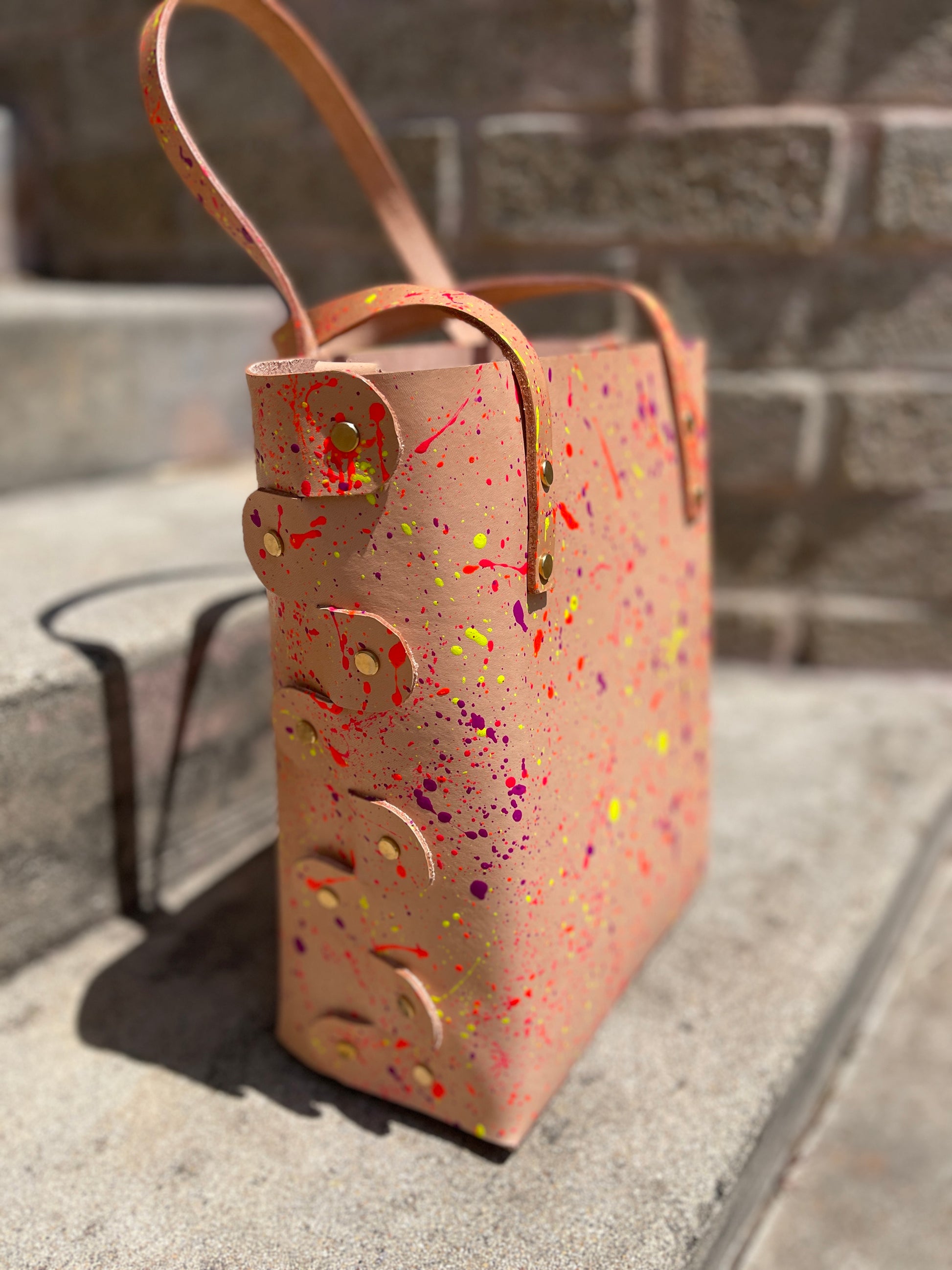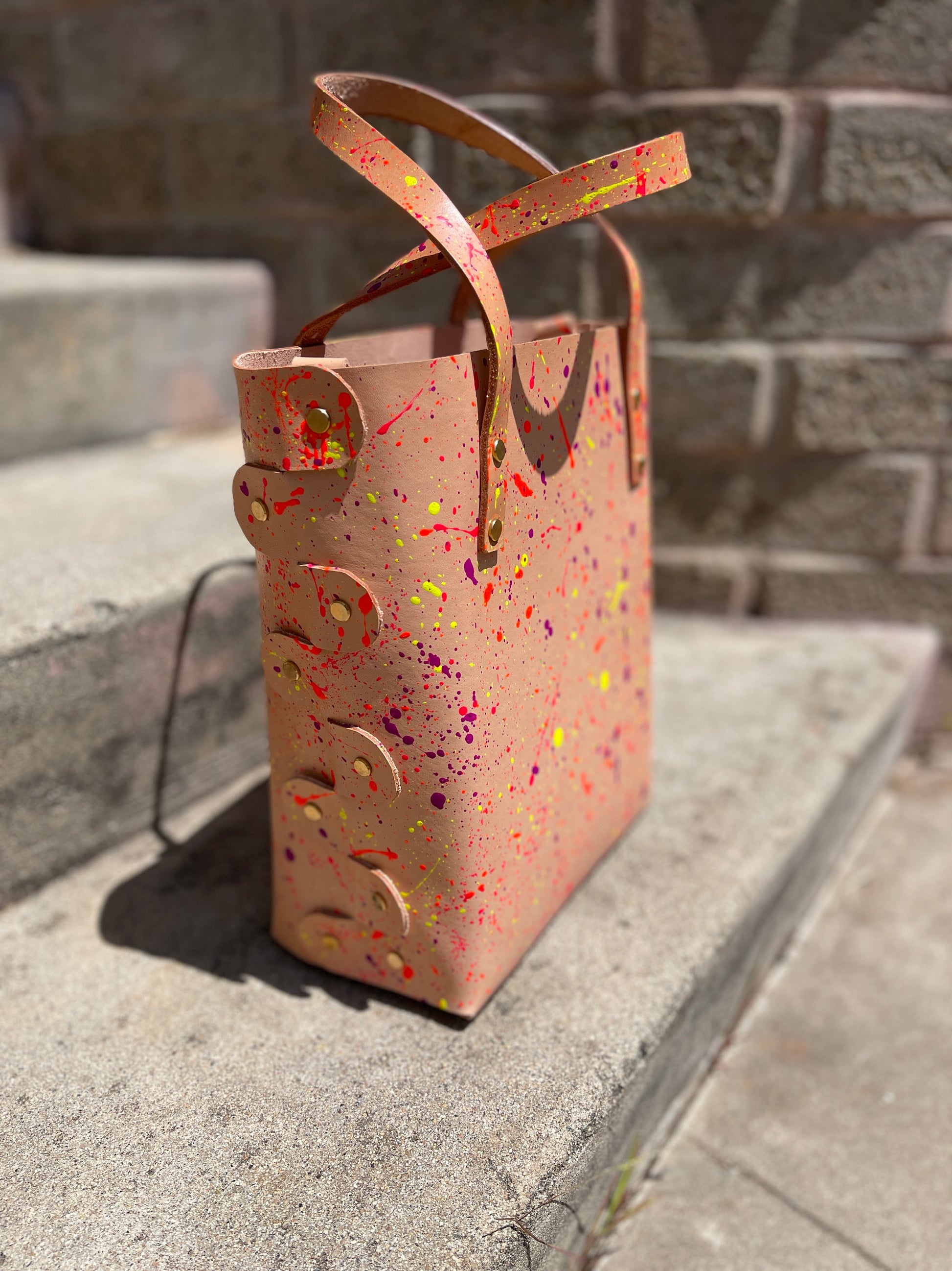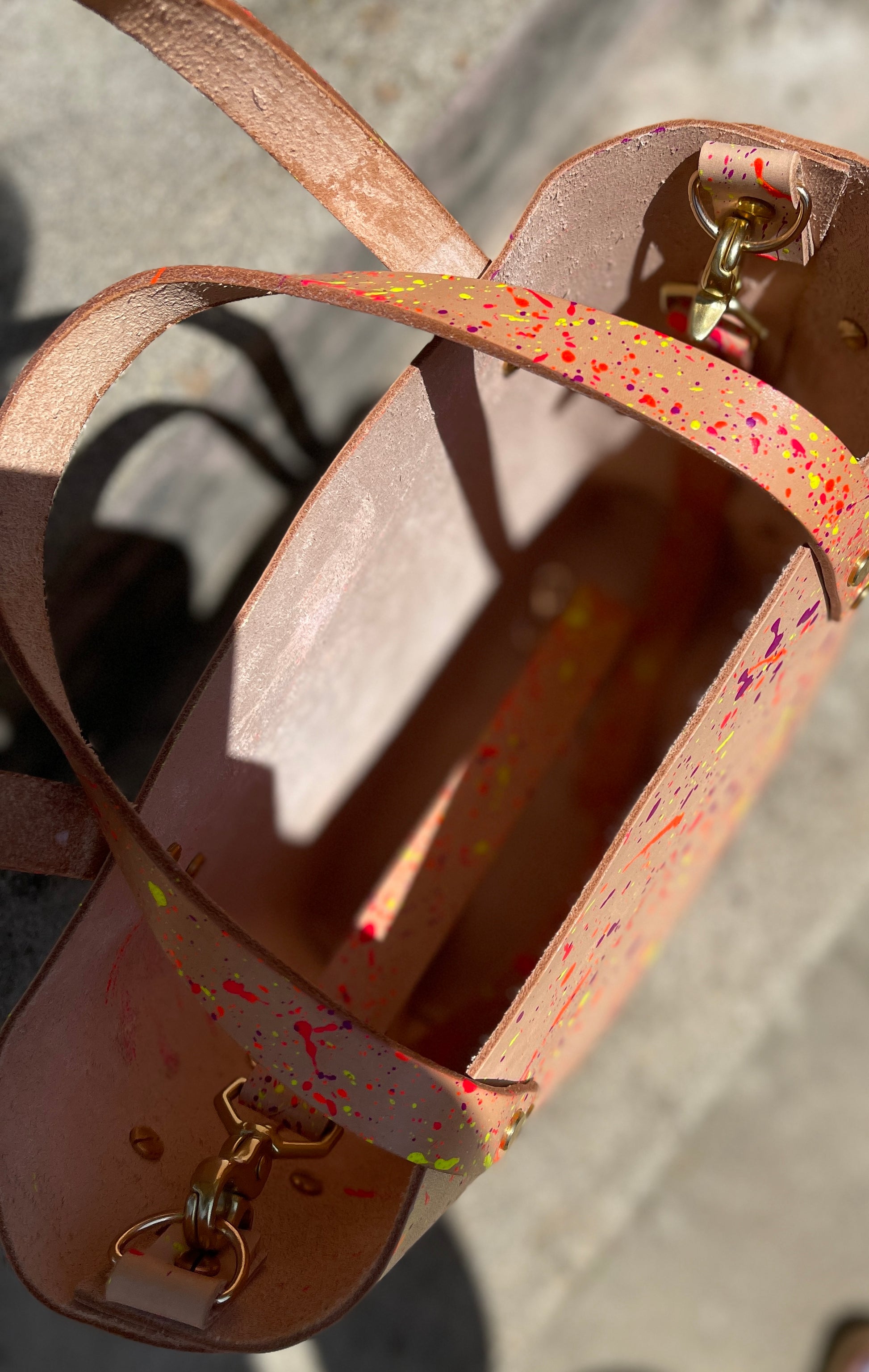 One-of-a-kind, hand painted 4 oz veg tan leather open top bag. Has hand straps and a detachable matching cross body strap and our standard “don’t lose yer keys” strap inside. High quality solid brass hardware. Really sturdy, utilitarian natural leather that will develop a lovely patina over time.