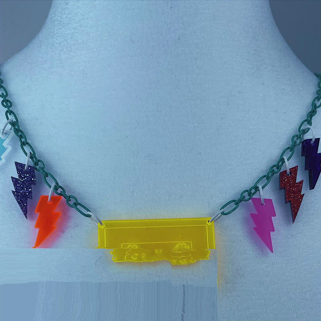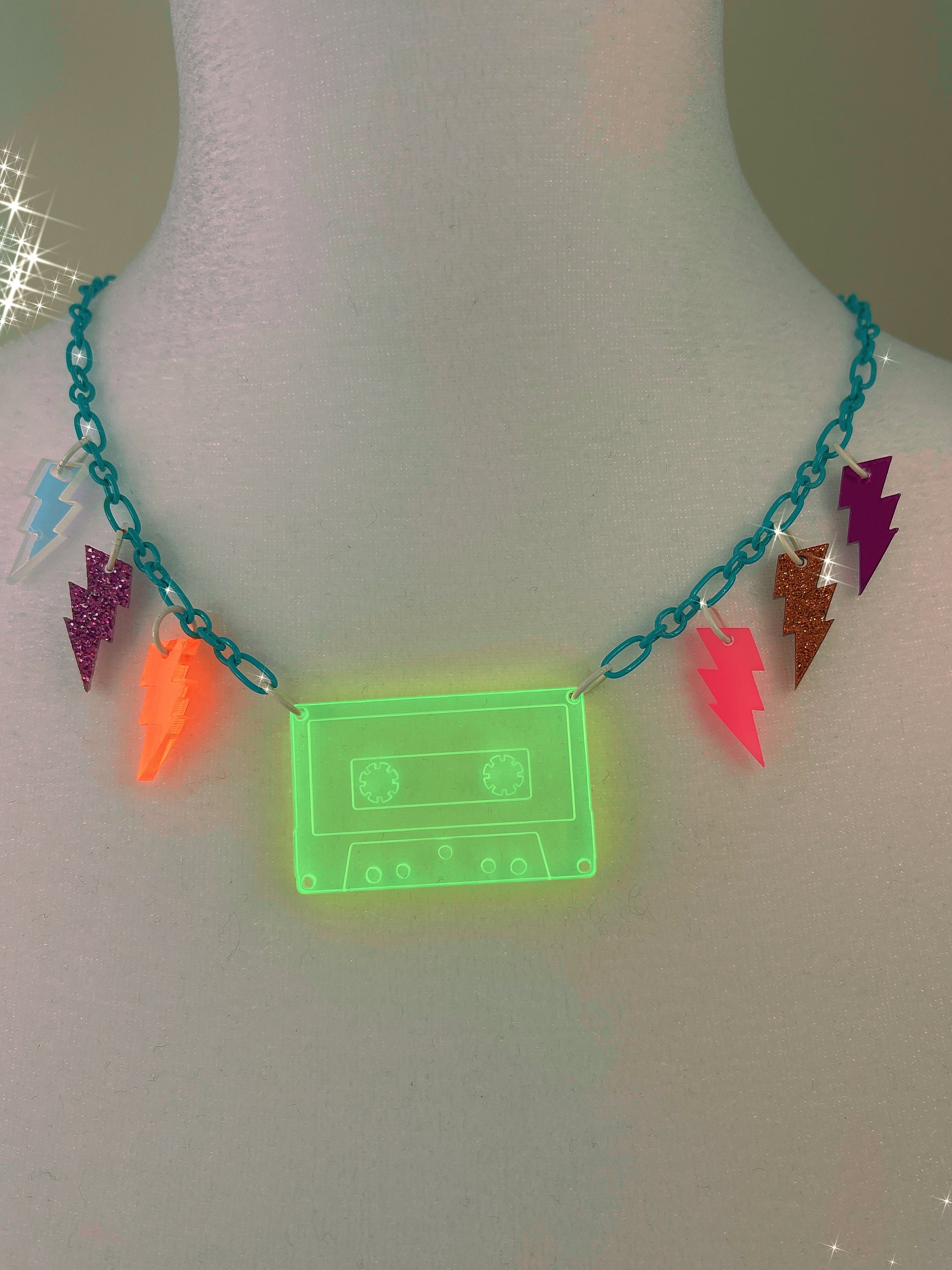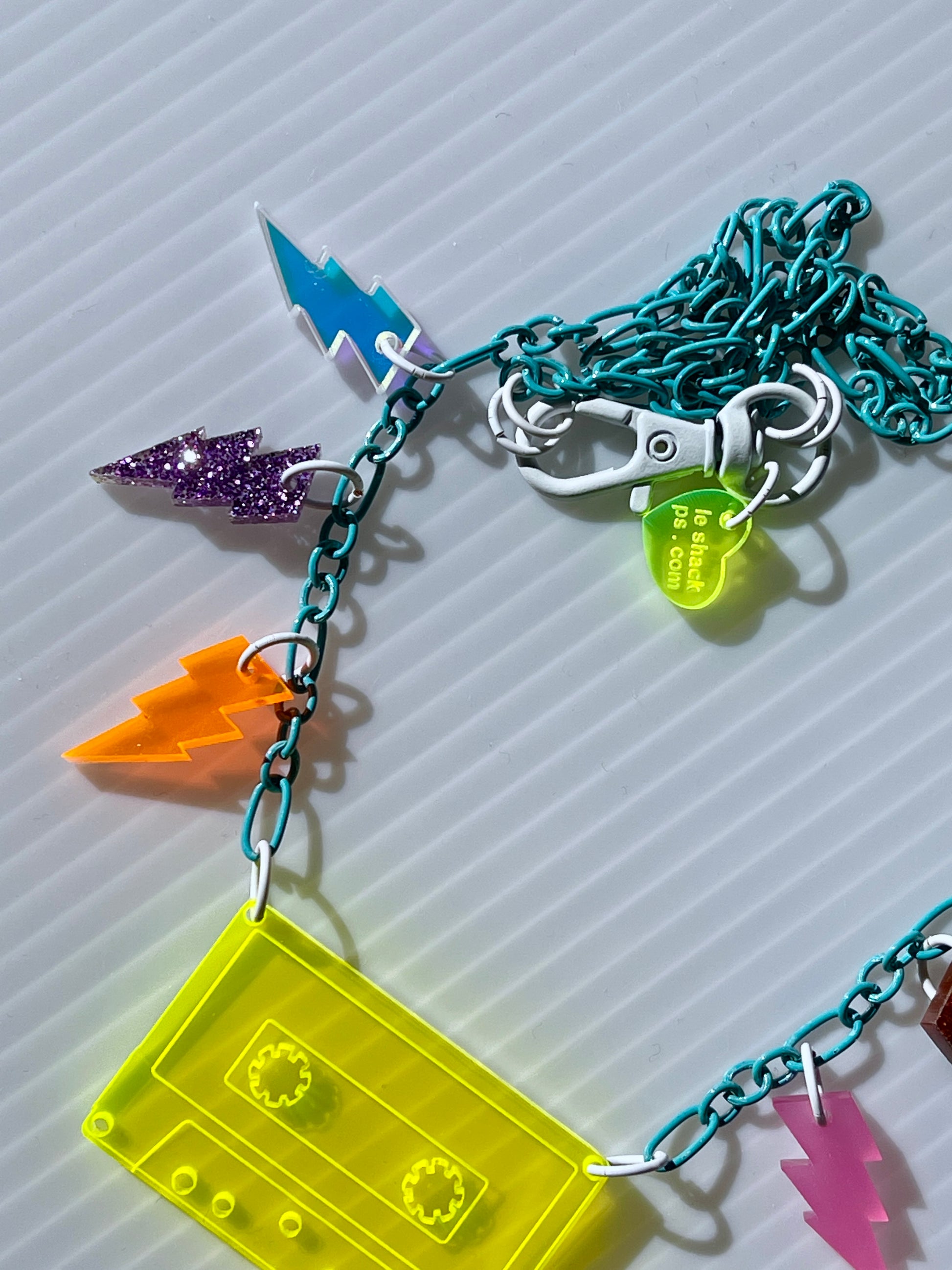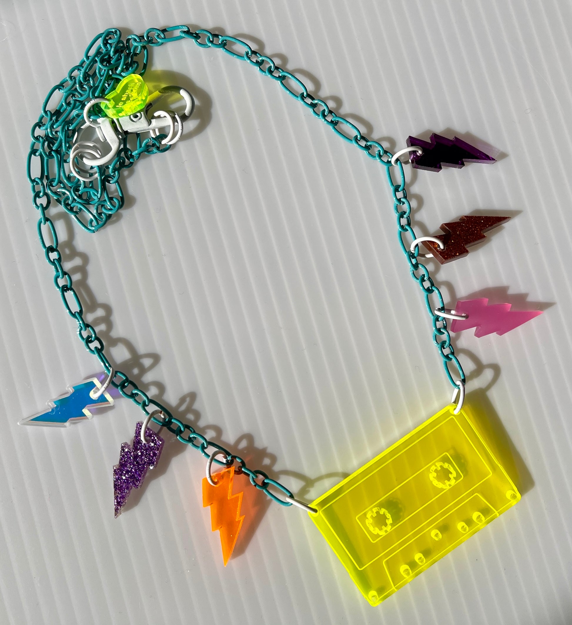 We have a thing for clear colored plastic, so we made this neon yellow acrylic laser cut cassette the focal point of this necklace. This is made with this super cute vintage turquoise blue enamel chain, white enamel jump rings, multi-color lightening bolt charms, swivel clasp (this will seem annoying at first but trust us, it gets better!) and one of our new signature tags! Please note that these are delicate materials and the acrylic can scratch very easily, and the vintage chain, though deadstock/unused, has minor marks because it is at least 40 years old.
